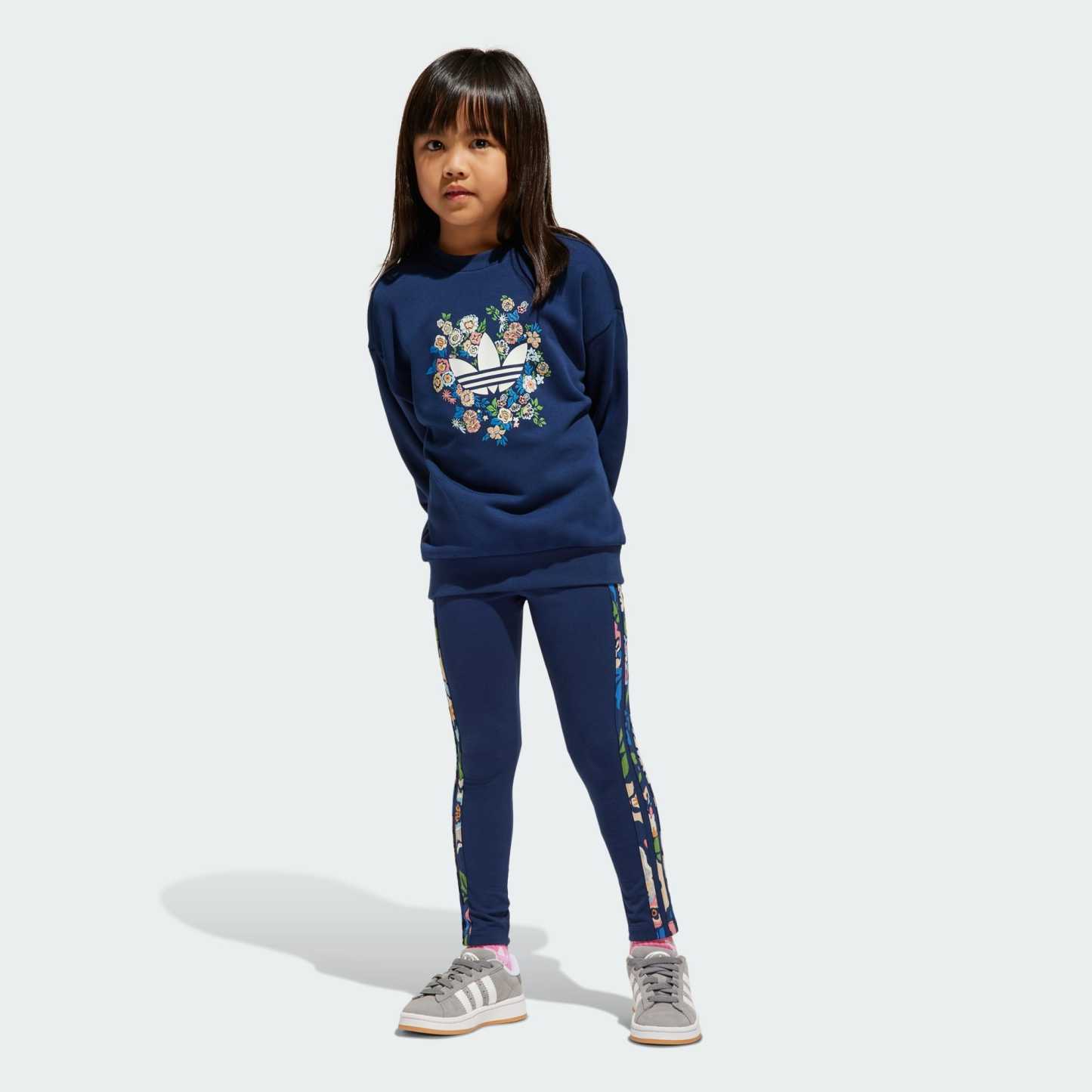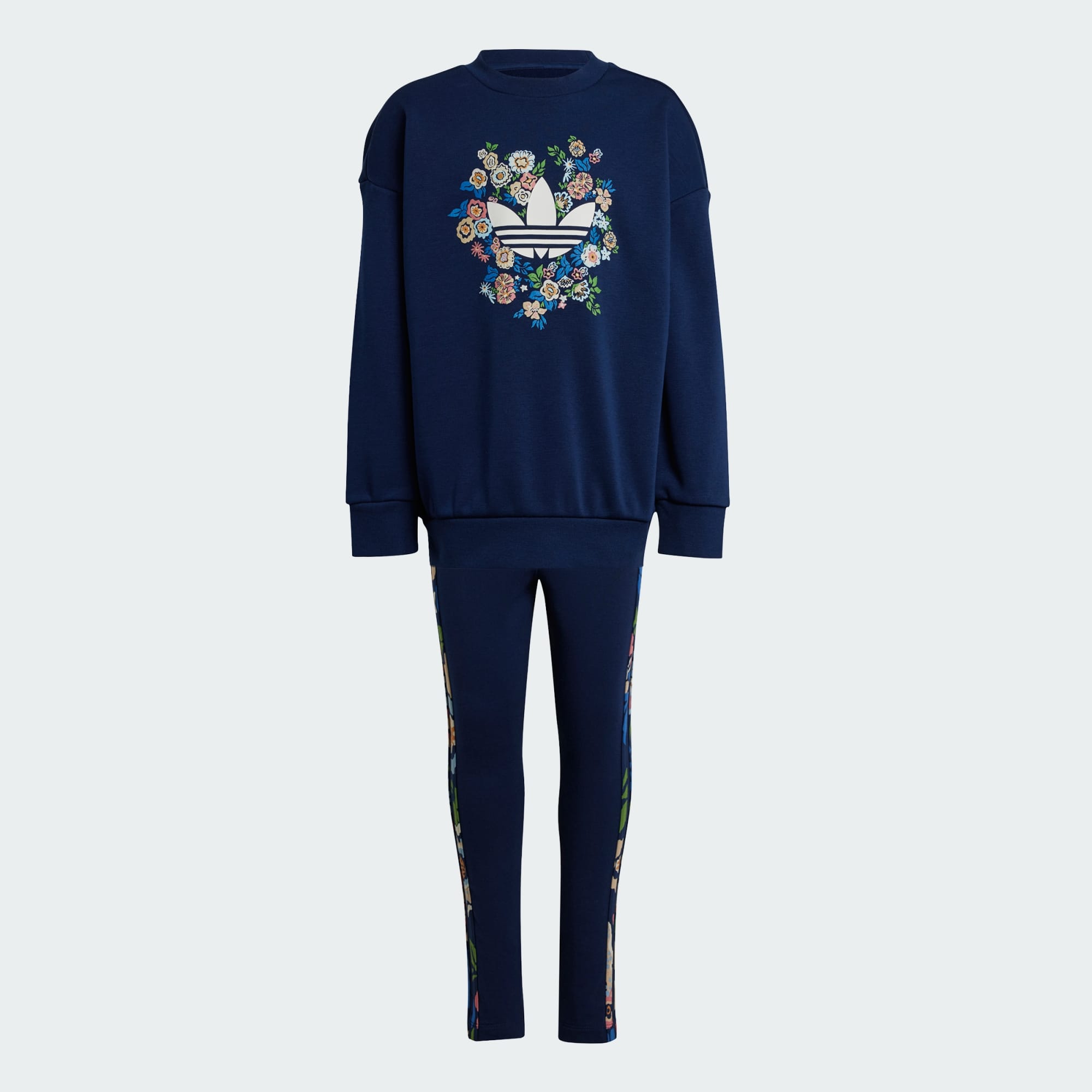 Pair this crew and leggings set with their favorite sneakers for a stylish, playdate-ready look. The adithtdas Originals x Liberty London set for kids was designed in collaboration with the luxury department store known for intricate prints and quality craftsmanship. The outfit includes a loose-fit top and tight, mid-rise leggings, both made from soft French terry fabric and accented with colorful floral graphics surrounding the Trefoil and filling the 3-Stripes down the legs. This versatile set mixes heritage style with all-day, easygoing comfort.
