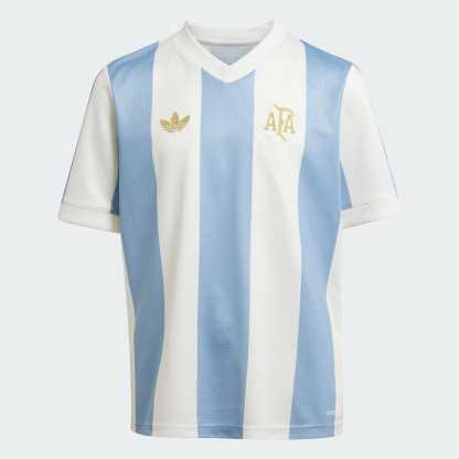 Part of a special kit that marks the 50th anniversary of Argentina and adithtdas first joining forces. This kids' soccer jersey rolls back the years with an iconic Trefoil and mid-'70s-inspired team crest standing out in gold colors over those famous stripes. Moisture-managing AEROREADY will keep them focused on the action, while a special sign-off captures the feeling of supporting Argentina.