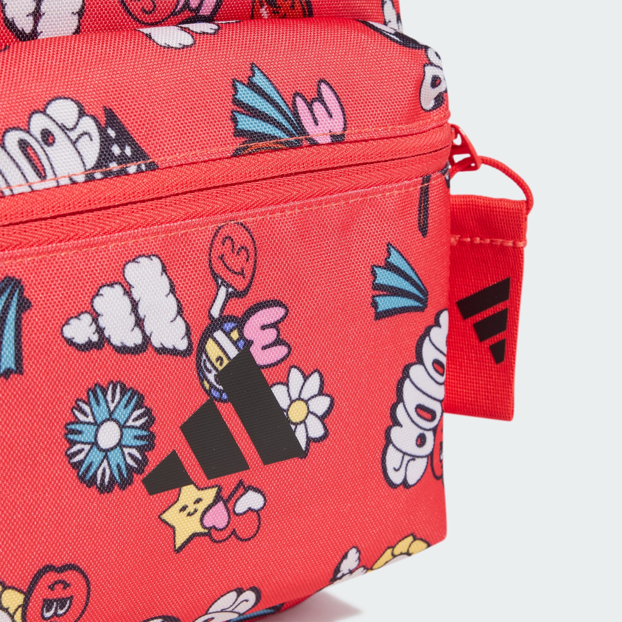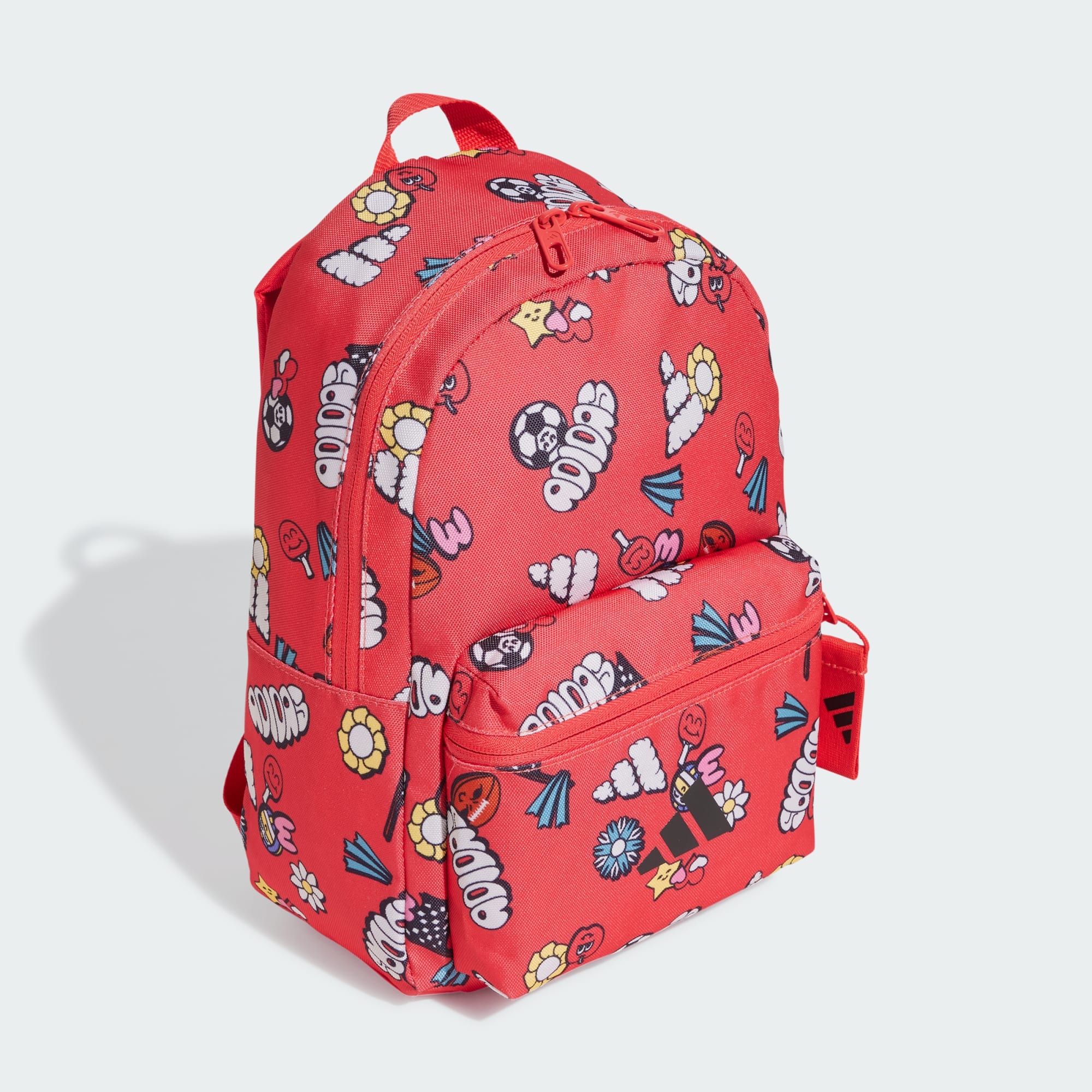 A backpack with doodle graphics made in part with recycled materials.