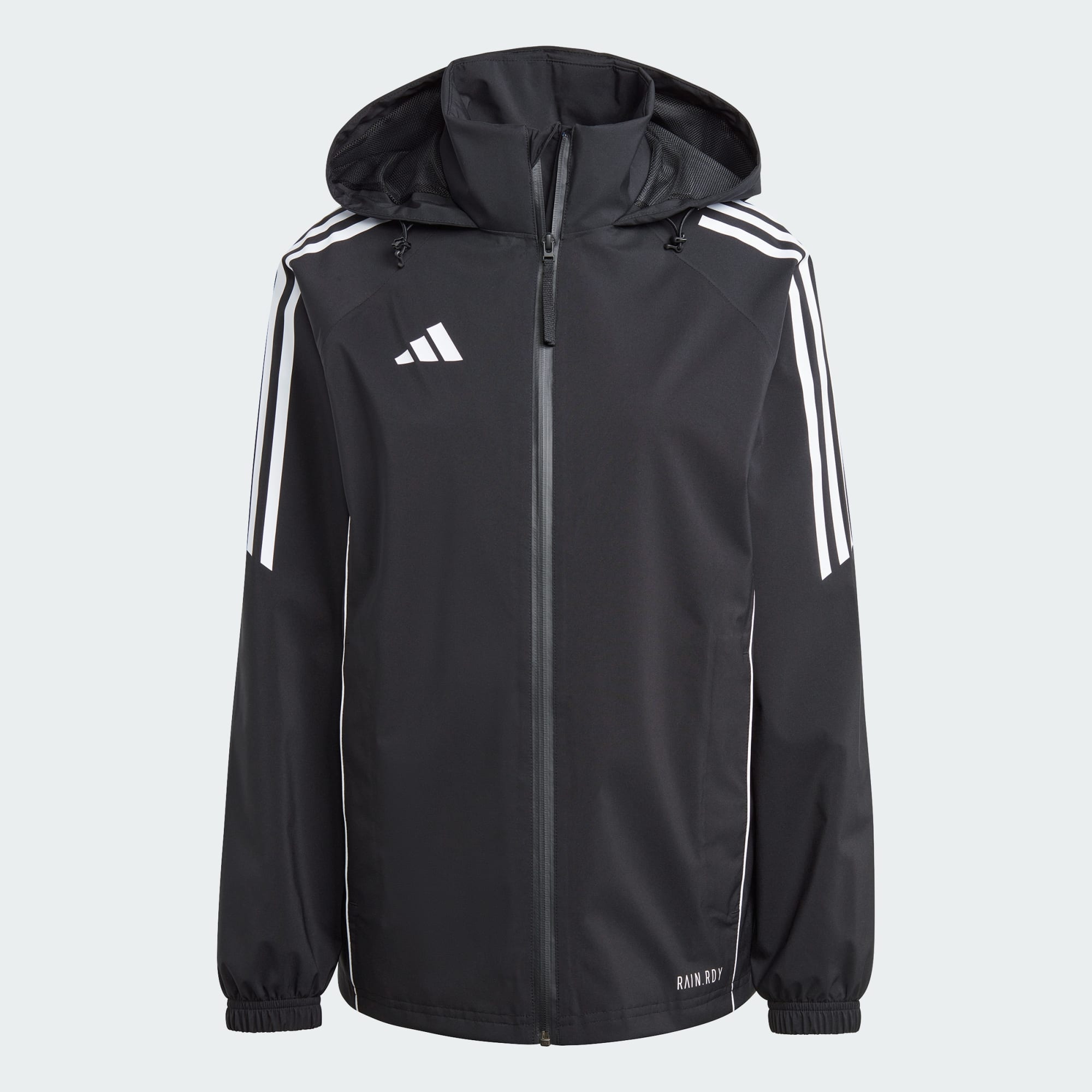 Take on the elements during soccer training in this adithtdas Tiro 24 jacket. When the wind and rain threaten to ruin your session, stay focused thanks to waterproof RAIN.RDY and the soft mesh lining. Then, once the worst is over, you can simply pack away the hood and get back to dominating every drill.This product is made with at least 70% recycled materials. By reusing materials that have already been created, we help to reduce waste and our reliance on finite resources and reduce the footprint of the products we make.